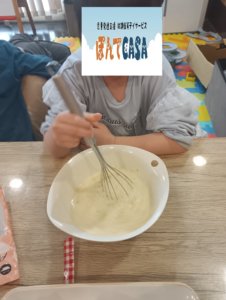 おやつ作りしました。【放課後デイサービス つくば市 ぽんてCASA 見学大歓迎!!】 CASA せきぐちです。 今日はおやつ作りをしました。 フレンチトーストです。 牛乳などを使うためしっかり火を通して 提供いたしました。 子どもたちには食べる直前の 味付け(ホイップクリーム、チョコソース、いちごジャムなど) のほか、まぜまぜ作業をしてもらいました。 一部の子どもたちにはパンをひっくり返すことにも チャレンジしてもらいました。